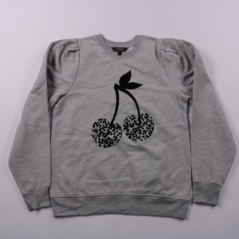 Женский свитшот Lipsy London серого меланжевого цвета с принтом вишни и объёмными рукавами. Подойдёт для повседневных образов и прогулок в демисезон, легко сочетается с джинсами и юбками. Трикотаж с добавлением эластана хорошо тянется и комфортно сидит.