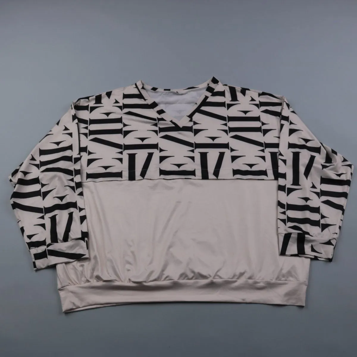 Женский свитшот с V-образным вырезом и контрастным чёрно-белым геометрическим принтом на плечах и рукавах. Подойдёт для повседневных образов и прогулок в прохладную погоду. Полиэстер быстро сохнет и прост в уходе.