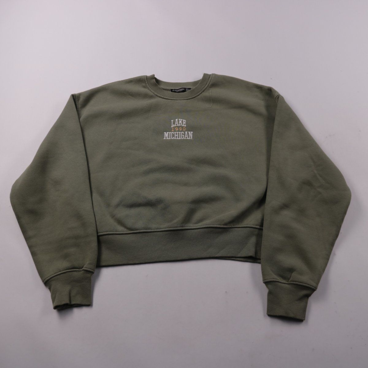 Свитшот Stradivarius цвета хаки с вышивкой «LAKE 1990 MICHIGAN» на груди и круглым вырезом. Подойдёт для повседневных образов и прогулок в прохладную погоду, хорошо сочетается с джинсами и брюками. Трикотаж с мягкой изнанкой комфортно носить и легко стирать.