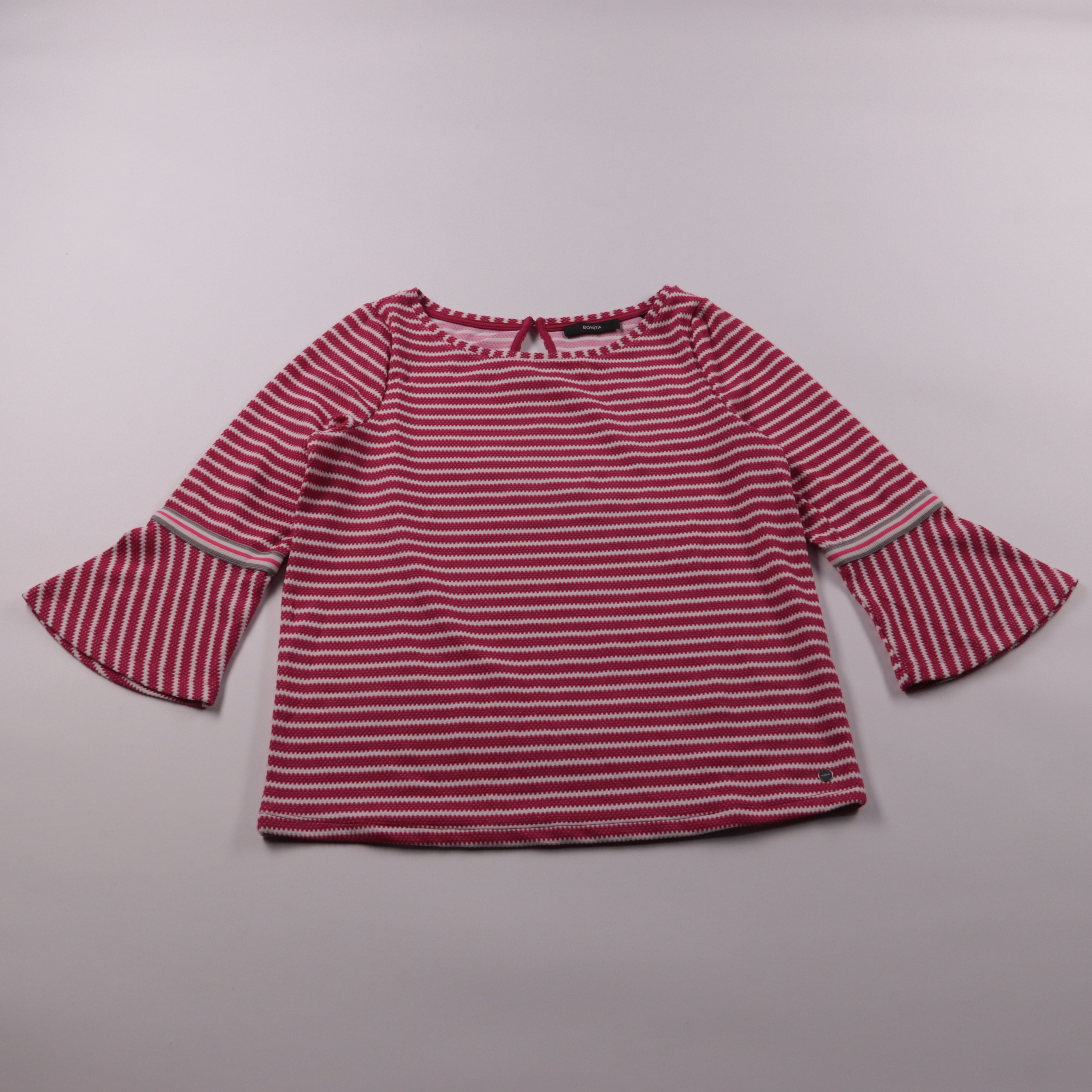 Лонгслив Bonita в красно-белую полоску с расклешёнными рукавами и аккуратной завязкой у горловины. Подойдёт для повседневных образов в межсезонье, хорошо смотрится с джинсами и юбками. Трикотаж тянется и комфортно садится по фигуре.