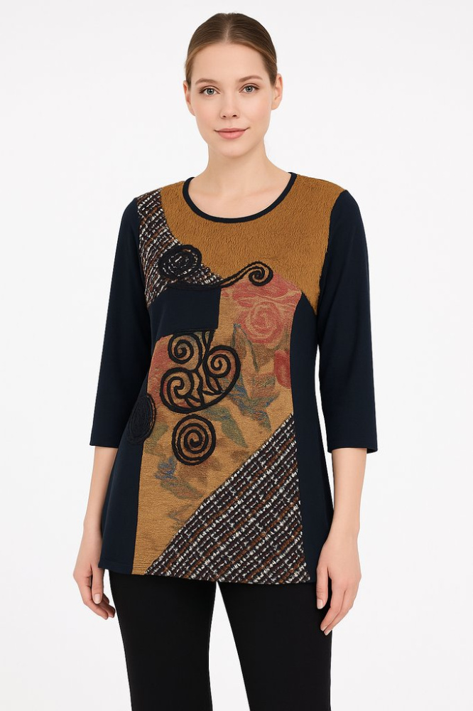 Лонгслив FranC de mer с рукавом 3/4 и декоративной вставкой с принтом в коричнево-чёрной гамме. Подойдёт для повседневных образов и офиса, хорошо сочетается с однотонными брюками или джинсами. Практичный плюс — хлопковая основа приятна к телу и комфорт...
