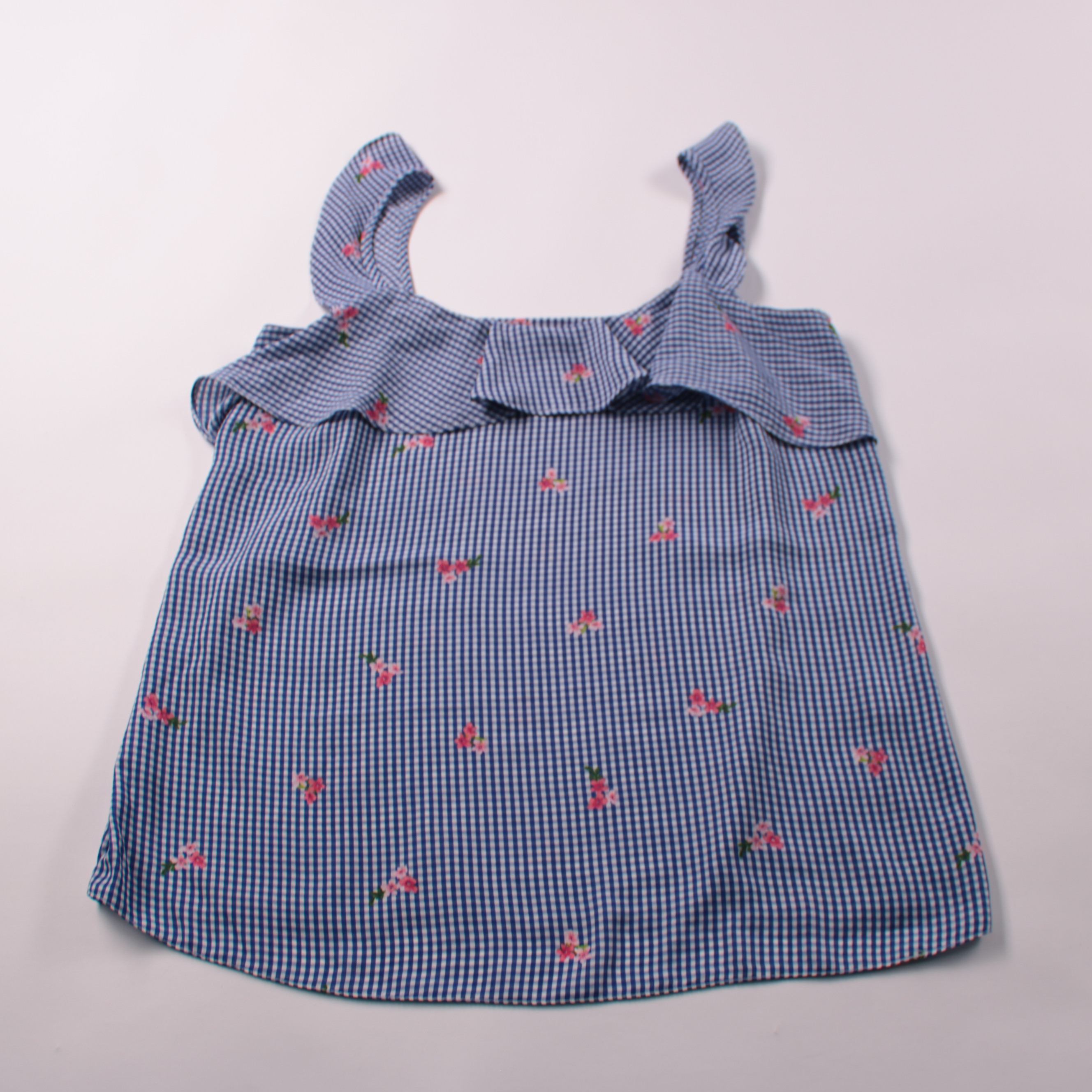 Женский топ Atmosphere в сине-белую клетку виши с мелким цветочным принтом и оборками на бретелях. Подойдёт для летних прогулок и отпуска, легко сочетается с джинсами, шортами или юбкой. Ткань из полиэстера почти не мнётся и быстро сохнет.