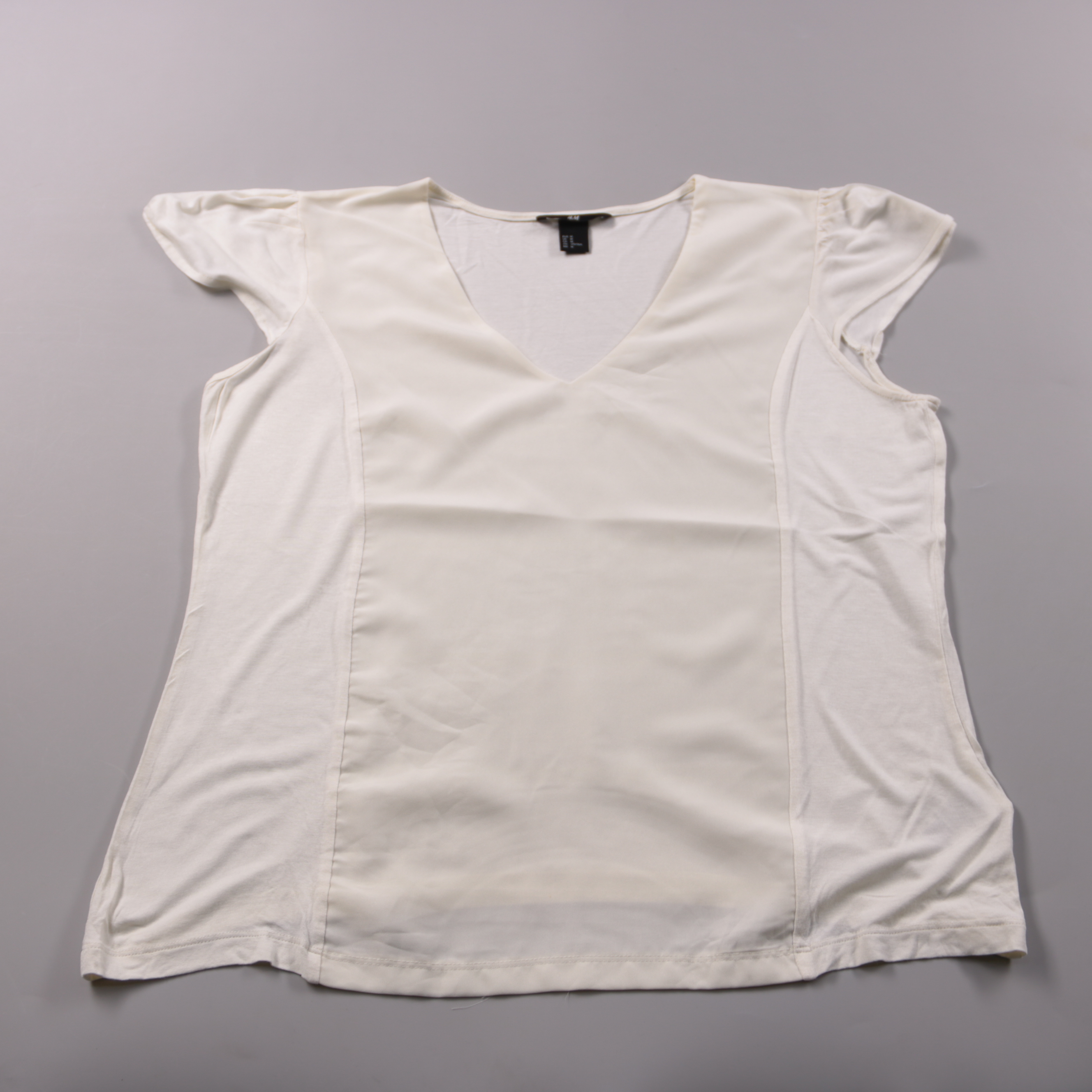 Женская футболка H&M молочного/белого цвета с V-образным вырезом и коротким рукавом, спереди гладкая вставка. Подойдёт для офиса и повседневных образов, легко сочетается с джинсами и юбками. Практична тем, что тонкая и лёгкая, удобно носить под жакет и...