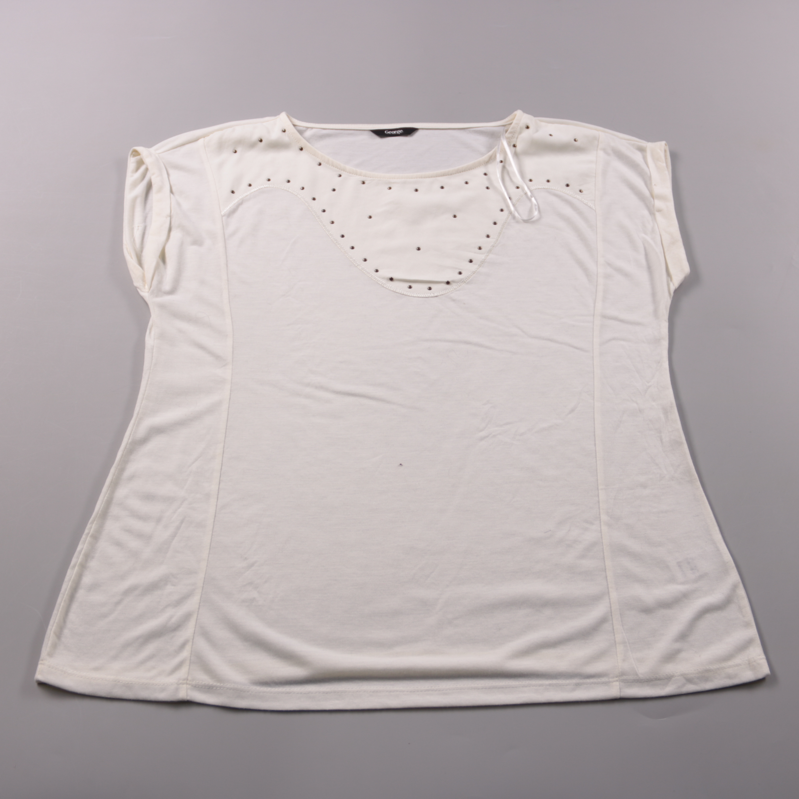 Женская футболка George молочного цвета с декоративными заклёпками в зоне горловины. Подойдёт для повседневных образов и офиса с жакетом, хорошо сочетается с джинсами или юбкой. Мягкий трикотаж комфортно сидит и легко стирается.