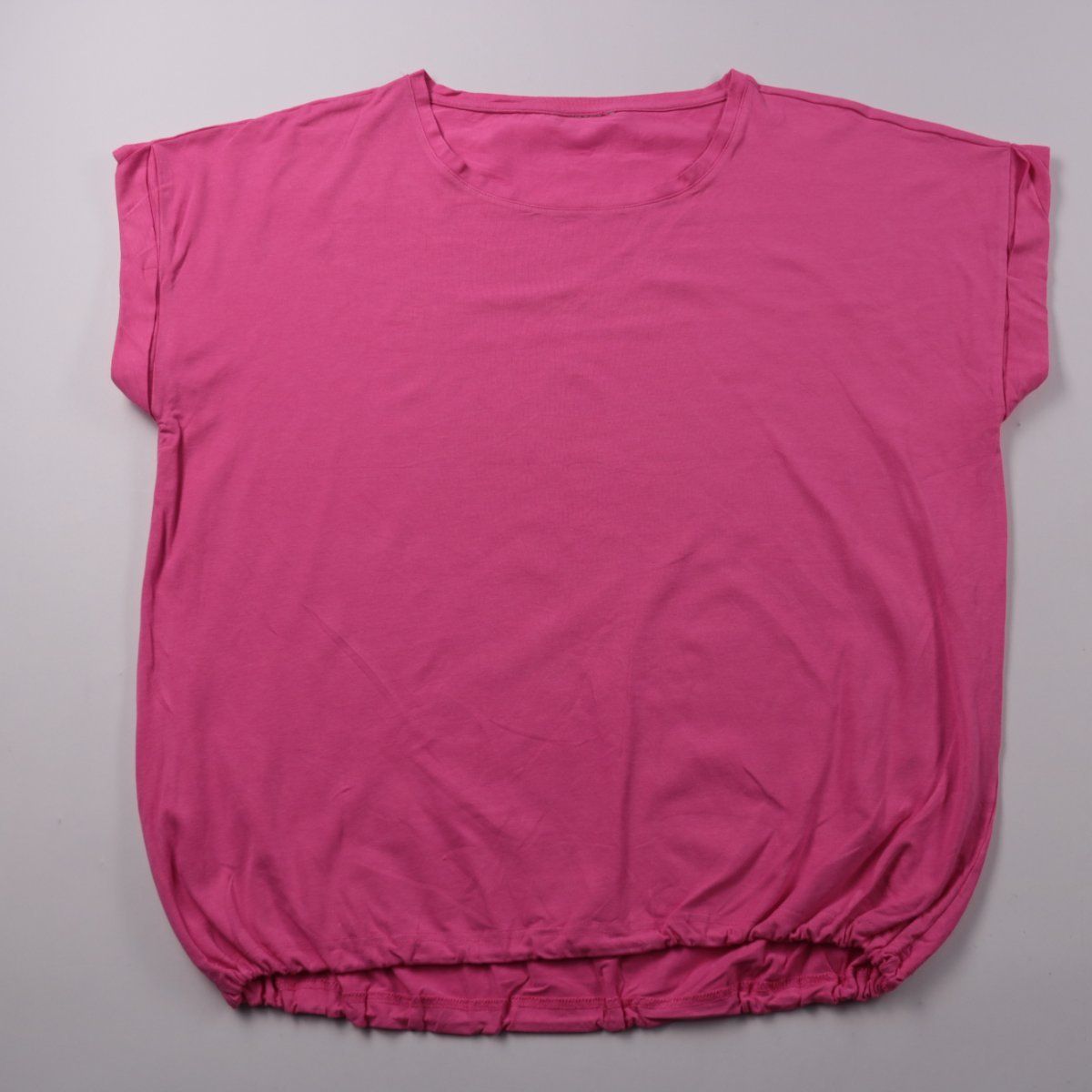 Женская футболка свободного кроя без бренда, ярко-розового цвета, с приспущенной линией плеча и эластичной сборкой по низу. Подойдёт для повседневных летних образов и отдыха, легко сочетается с джинсами, шортами или юбкой. Практичный плюс — резинка по низу помогает держать форму и не задирается при движении.