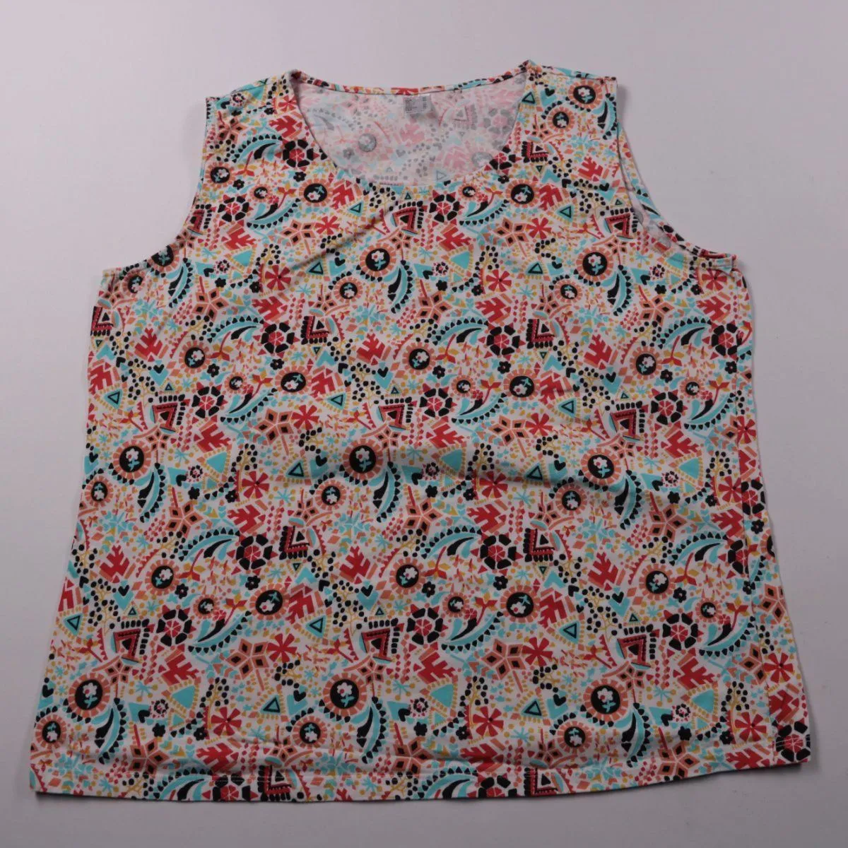 Женская майка с ярким геометрическим принтом и круглым вырезом. Подойдёт для летних прогулок и повседневных образов, легко сочетается с джинсами или шортами. Тонкий трикотажный материал комфортен в жаркую погоду.
