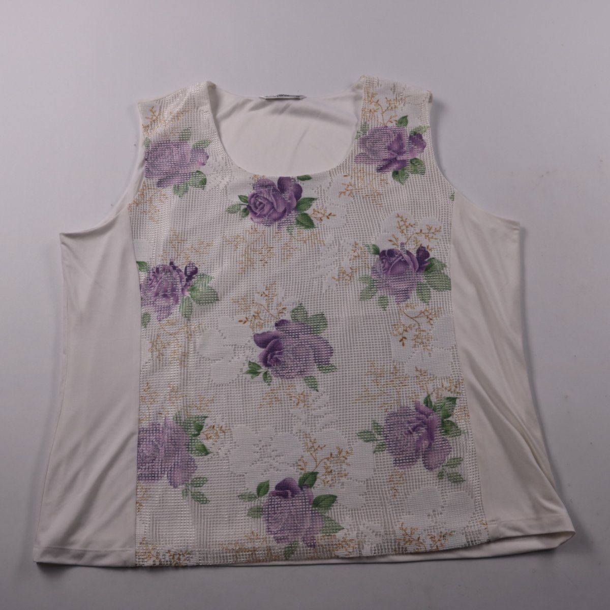 Женский топ Via Veneto без рукавов: спереди вставка с цветочным принтом (фиолетовые розы), спинка однотонная. Подойдёт для лета и тёплых дней, удобно носить с джинсами, юбкой или шортами. Практичный вариант: лёгкий, не сковывает движения и быстро сочетается с базовым гардеробом.
