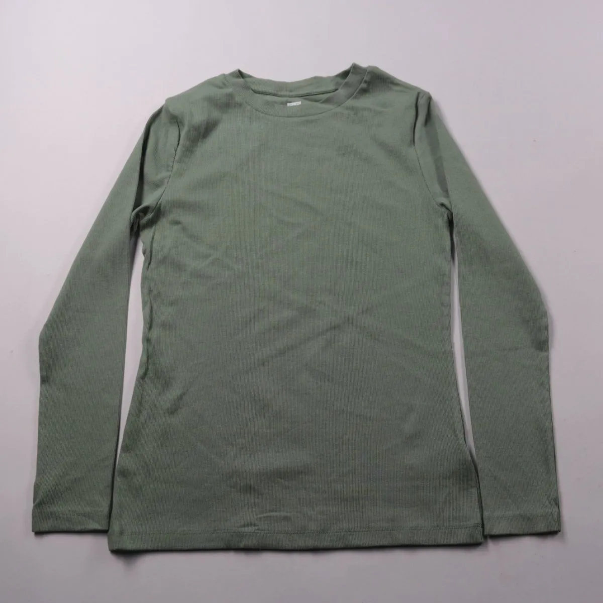 Женский лонгслив F&F в рубчик, цвет оливково-зелёный, с круглым вырезом и длинным рукавом. Подойдёт для повседневной носки и как базовый слой в прохладную погоду. Трикотажная фактура хорошо тянется и удобно садится по фигуре.
