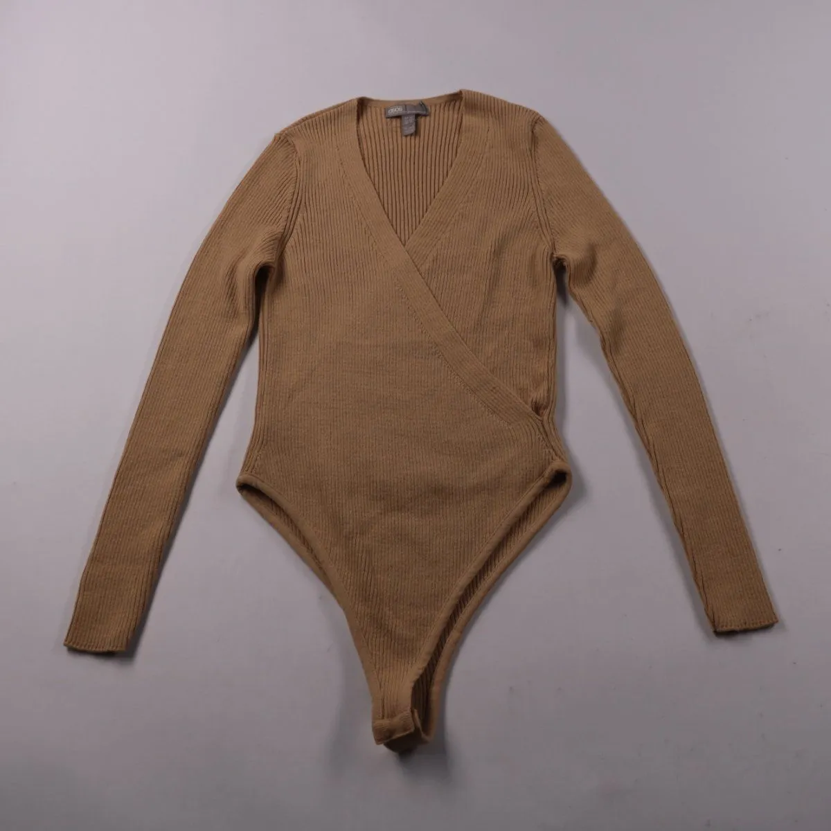 Женское боди ASOS бежевого цвета, выполнено из фактурного трикотажа в рубчик с запахом и V-образным вырезом. Подойдёт для повседневных образов в прохладную погоду, хорошо смотрится с джинсами и юбками с высокой посадкой. Эластичный материал комфортно облегает и не сковывает движения.