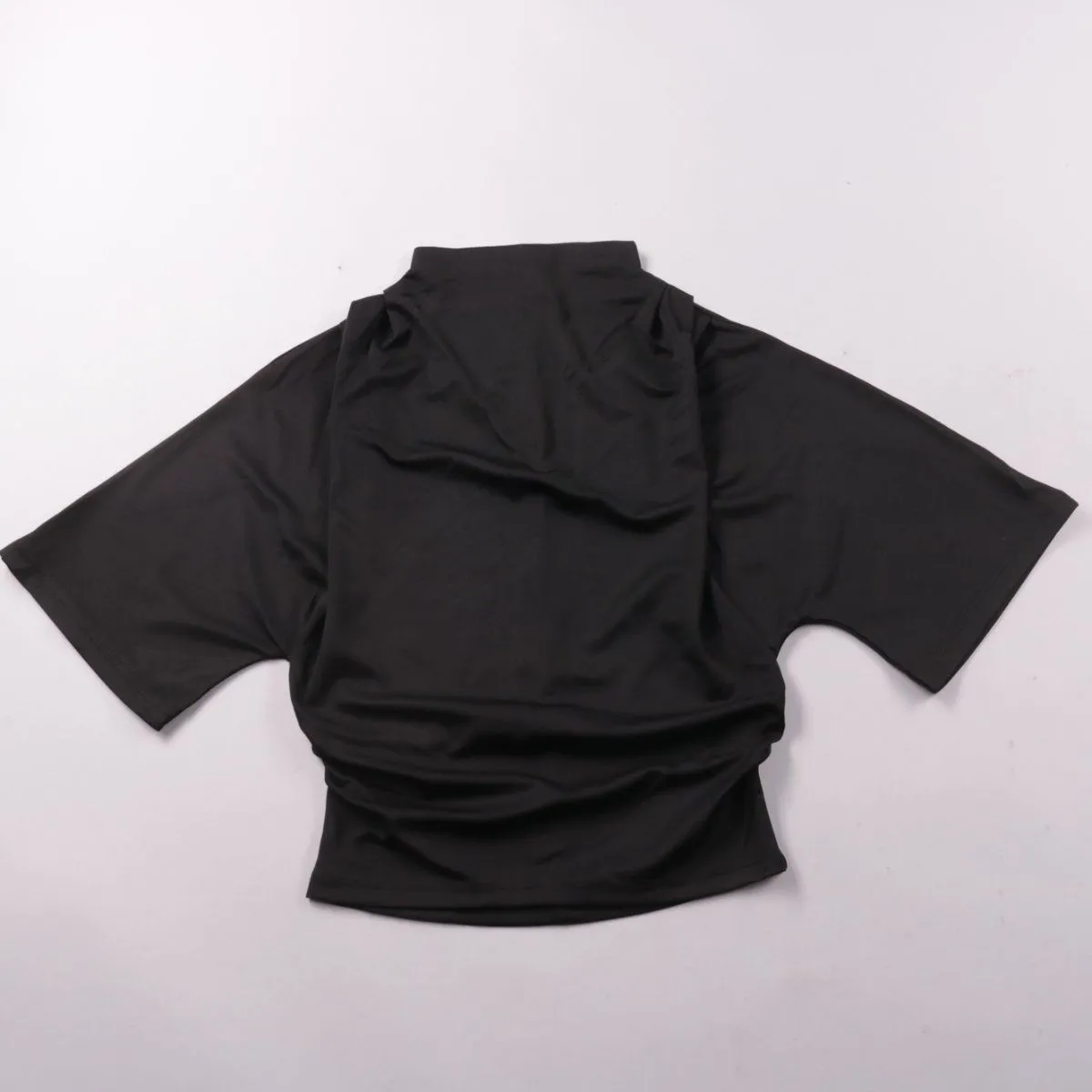 Женский чёрный топ Gina Tricot с высоким воротником и коротким рукавом, облегающего силуэта. Подойдёт для повседневных образов и как базовый слой под жакет или кардиган. Эластичная ткань хорошо тянется и комфортно садится по фигуре.