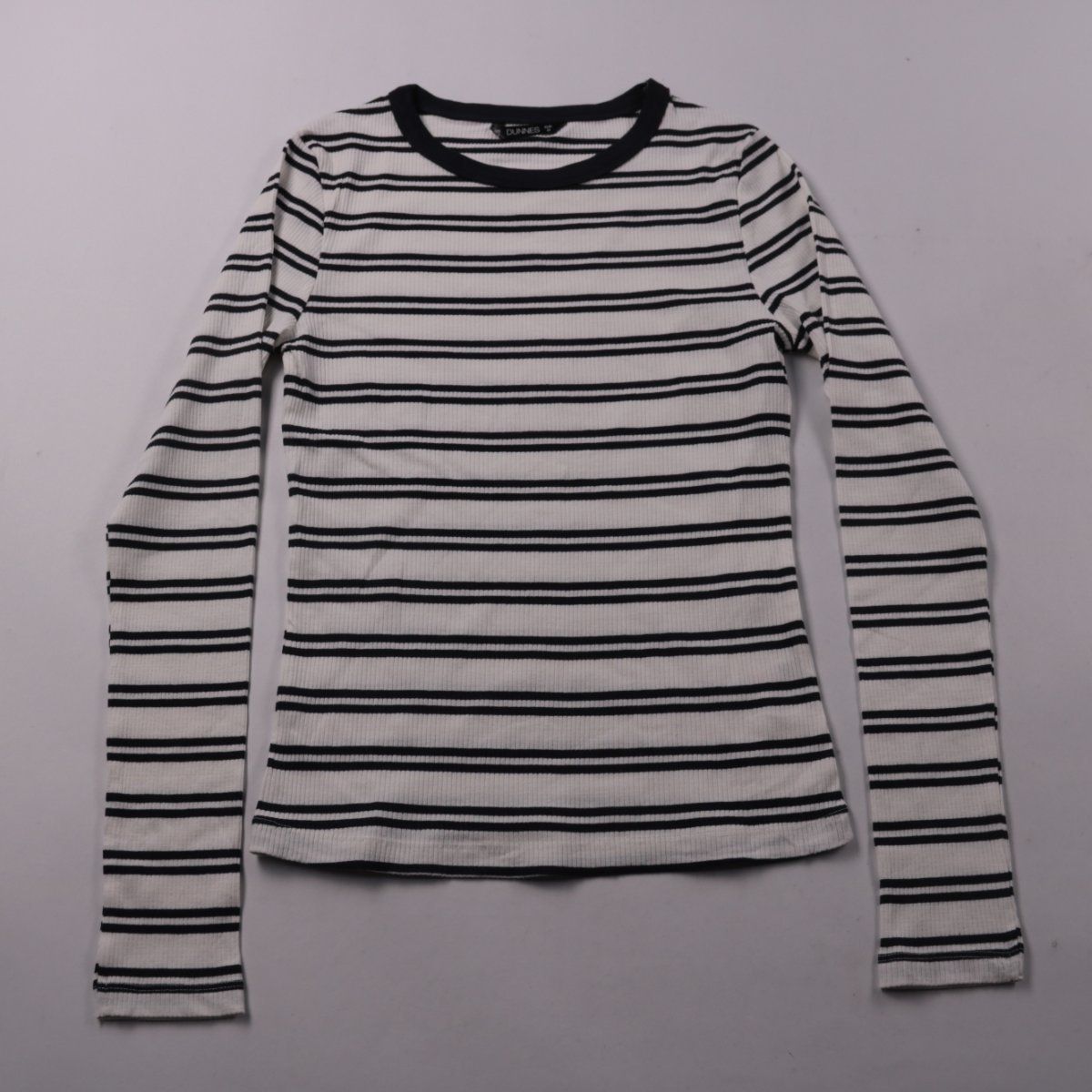 Лонгслив Dunnes в белом цвете с тёмными горизонтальными полосками и круглым вырезом. Подойдёт для повседневных образов и как базовый слой под жакет или жилет. Трикотаж в рубчик с добавлением эластана немного тянется и комфортно садится по фигуре.
