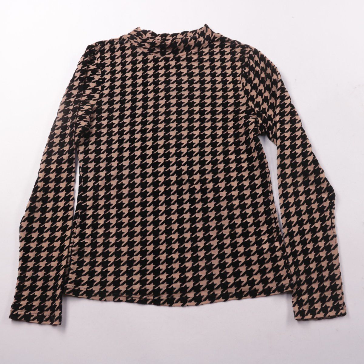 Женский лонгслив AMY & CLO с высоким воротником и принтом «гусиная лапка» в черно-бежевых тонах. Подойдёт для повседневных образов в прохладную погоду, можно носить как самостоятельный верх или под жакет. Ткань тянется за счёт эластана и комфортно садится по фигуре.