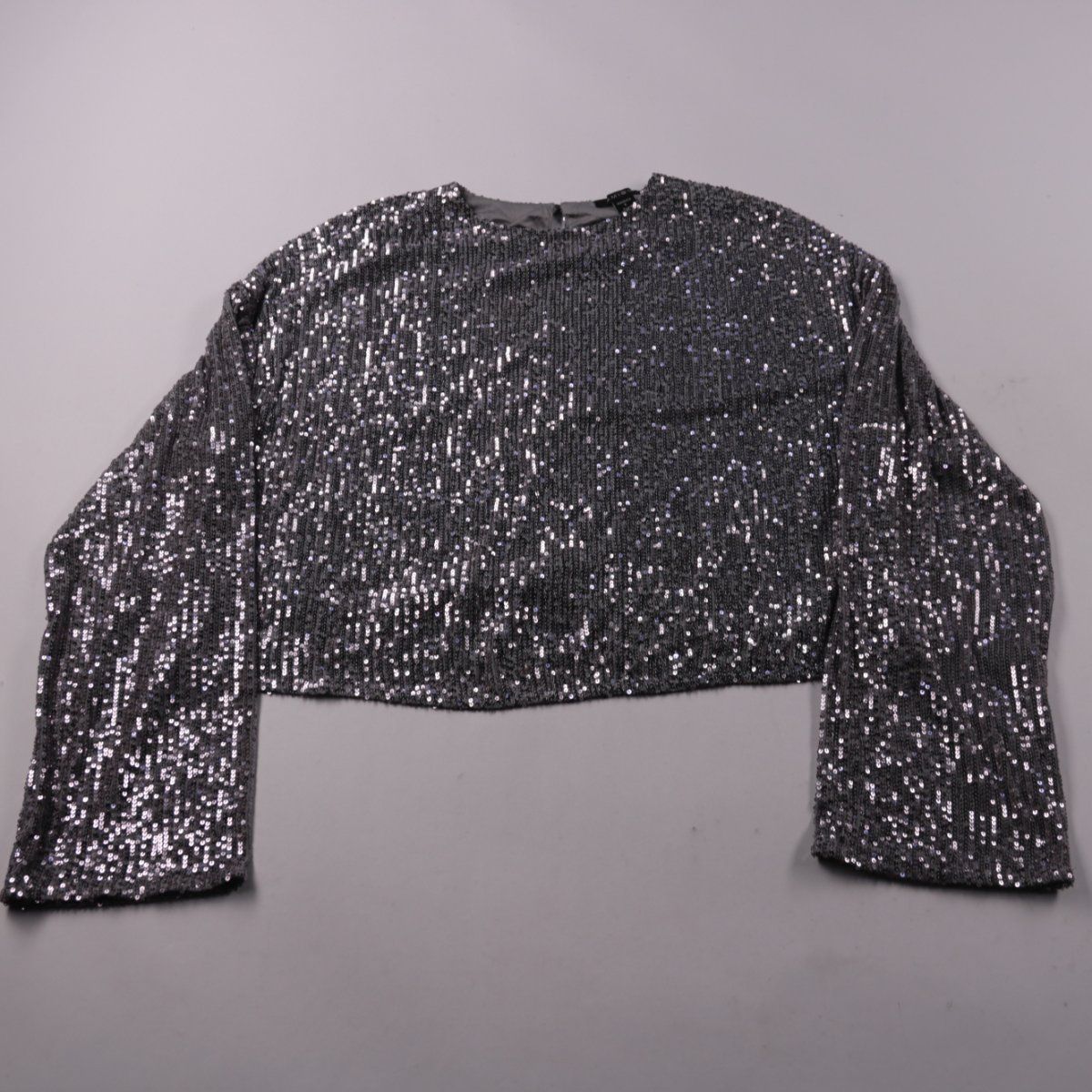 Женский укороченный лонгслив AMISU с пайетками и круглым вырезом. Подойдёт для вечеринок и праздничных образов, легко сочетается с однотонными брюками или юбкой. Застёжка на молнию сзади помогает аккуратно посадить изделие по фигуре.