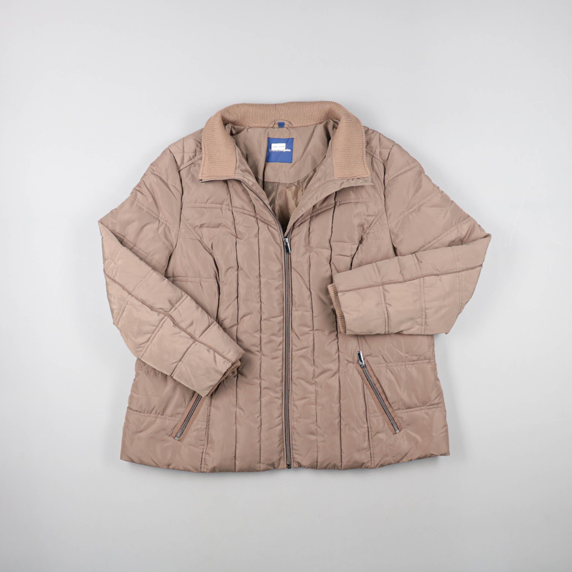 Демисезонная стёганая куртка Crosswalk в бежевом цвете с воротником-стойкой и застёжкой на молнию. Подойдёт для повседневной носки в прохладную погоду, удобно сочетается с джинсами и брюками. Практичный плюс — два кармана на молнии для мелочей.