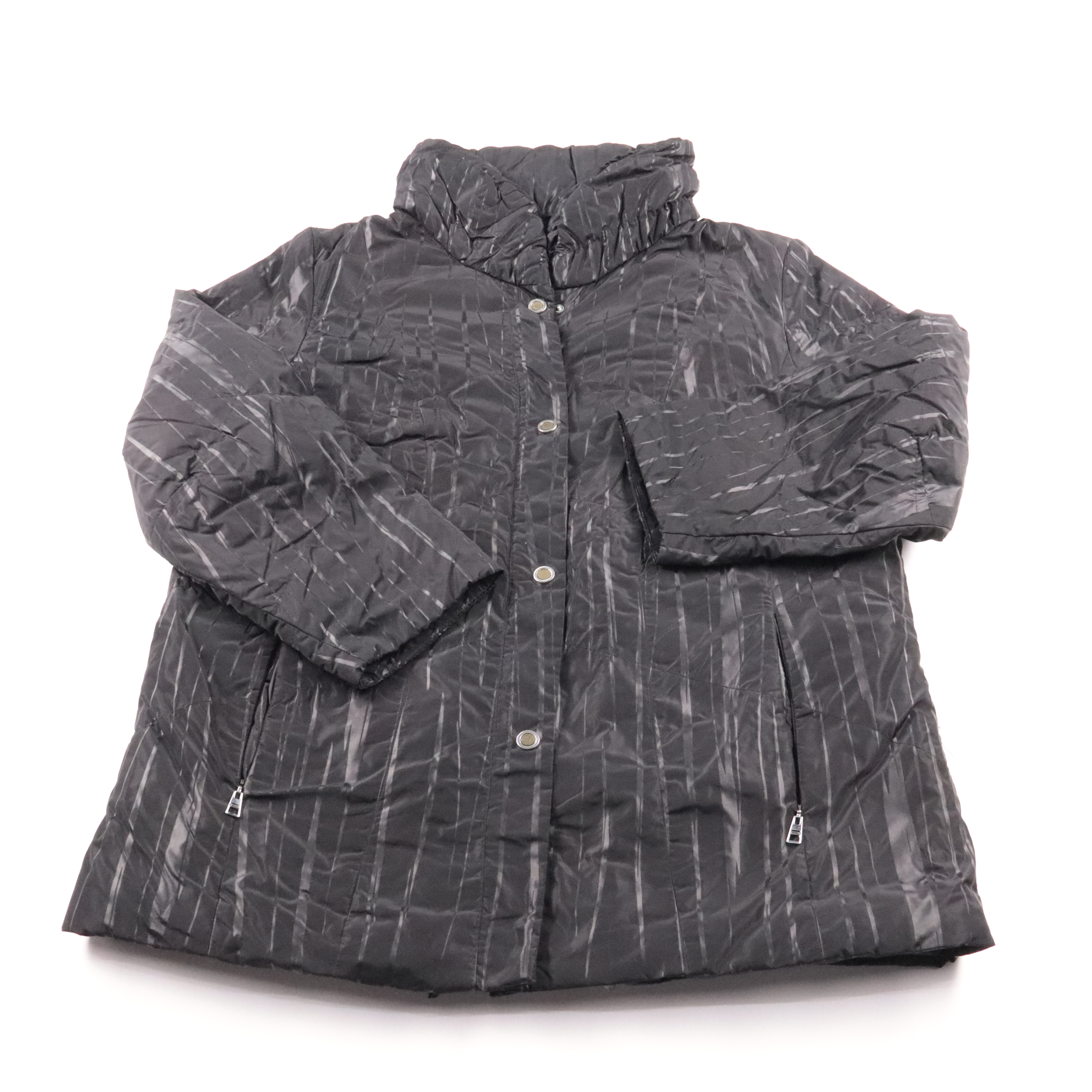 Женская стёганая демисезонная куртка в чёрном цвете с серым принтом и высоким воротником. Подойдёт для повседневных прогулок и поездок в прохладную погоду, легко сочетается с джинсами и брюками. Практичный плюс — застёжка на кнопки и карманы на молниях.