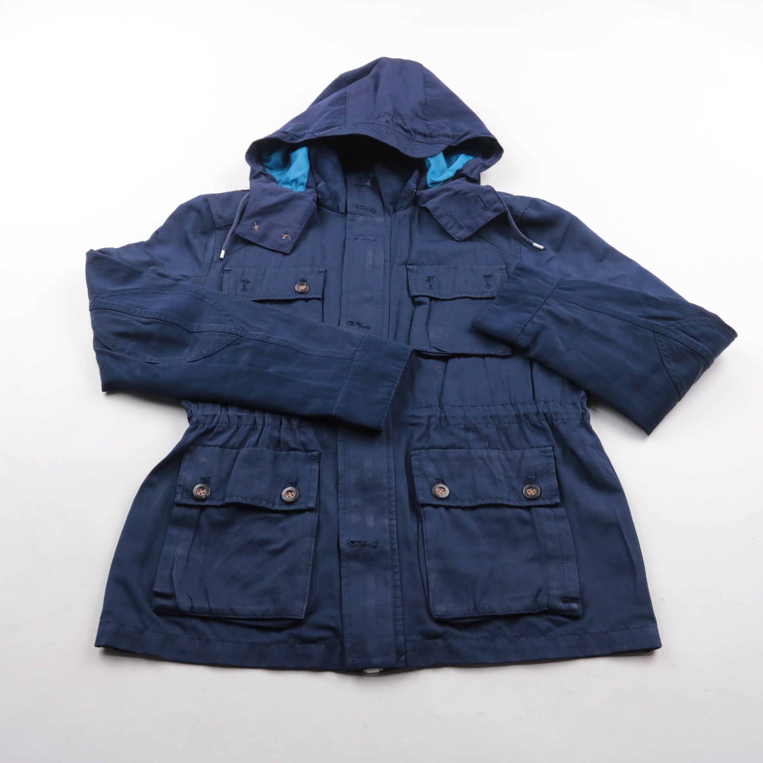 Демисезонная куртка H&M тёмно-синего цвета с капюшоном, кулиской на талии и накладными карманами на кнопках. Подойдёт для прогулок и города в прохладную погоду, легко сочетается с джинсами и повседневной обувью. Практичный плюс — капюшон и плотная ткан...