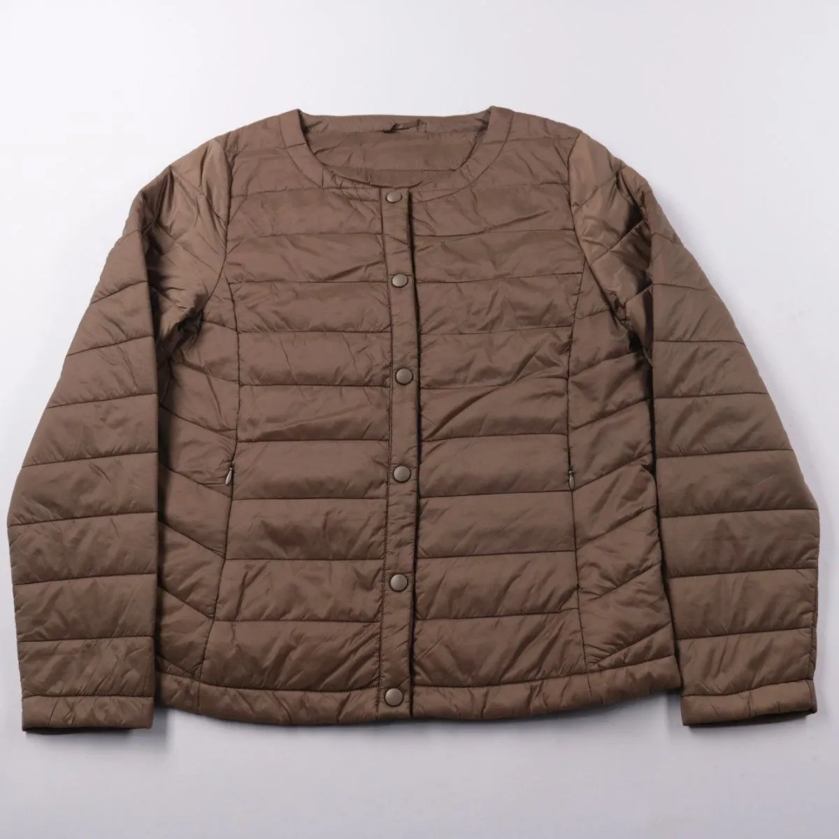 Стёганая лёгкая куртка Jazlyn коричневого цвета на кнопках, без капюшона. Подойдёт для прохладной весны и осени, удобно носить в городе и в поездках. Практичный плюс — лёгкая и компактно складывается, есть карманы на молнии.