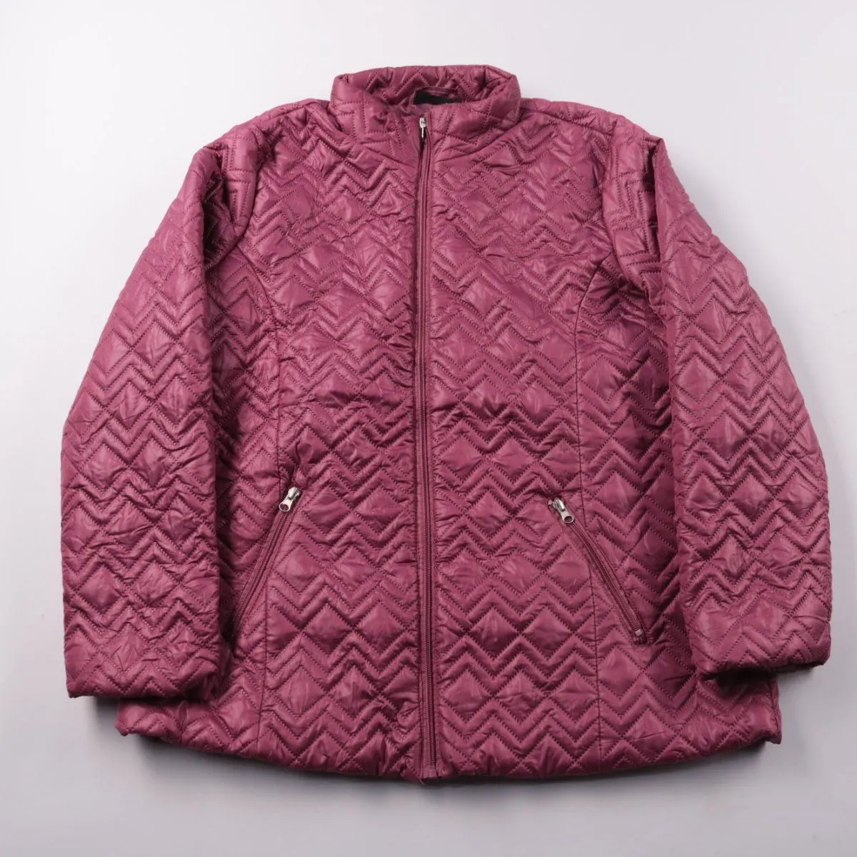 Стёганая демисезонная куртка Janina в бордовом цвете с геометрической простёжкой и воротником-стойкой. Подойдёт для прохладной весны и осени, удобно сочетается с джинсами и повседневной обувью. Лёгкая и практичная: застёгивается на молнию и имеет карманы на молниях.