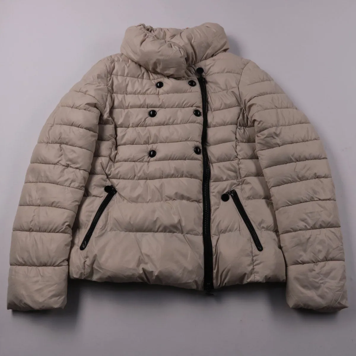 Стёганая женская куртка с высоким воротником-капюшоном и косой молнией, подойдёт для прохладной весны и осени. Удобна для повседневных прогулок и города благодаря лёгкому утеплению и карманам на молниях.