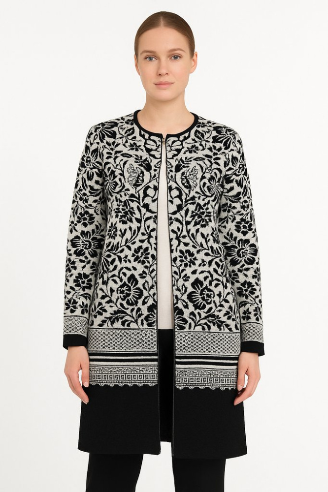 Пальто Leo & Ugo в чёрно-белом цвете с жаккардовым цветочным рисунком и контрастными бордюрами по низу и манжетам. Подойдёт для прохладной весны и осени, хорошо смотрится в офисных и повседневных образах. Трикотажный состав с вискозой приятно носится и...