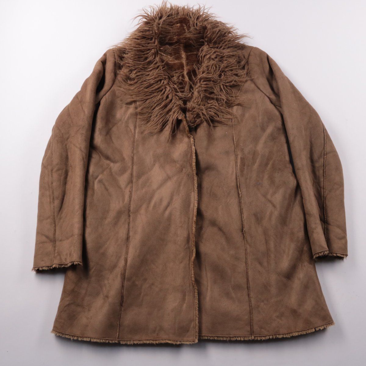 Женская дублёнка в коричневом цвете с объёмным меховым воротником. Подойдёт для повседневных зимних прогулок и поездок, хорошо сочетается с джинсами и ботинками. Практичный плюс — тёплая подкладка и закрытая линия застёжки, которая лучше защищает от ветра.