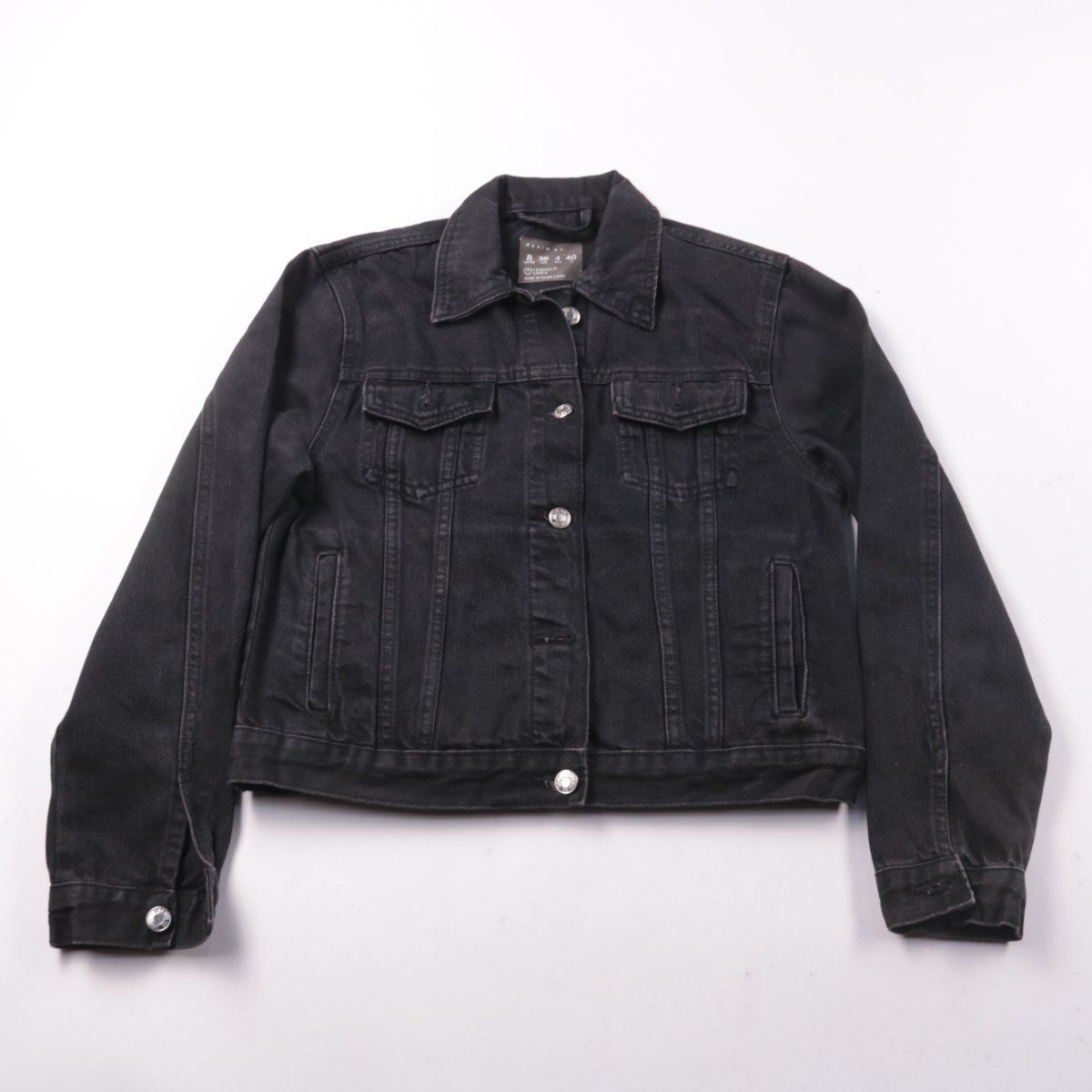 Джинсовая куртка Primark (Denim Co.) чёрного цвета на пуговицах, с нагрудными карманами и отложным воротником. Подойдёт для повседневных образов в межсезонье, удобно носить поверх футболки или худи. Плотный хлопковый деним хорошо держит форму и не требует сложного ухода.