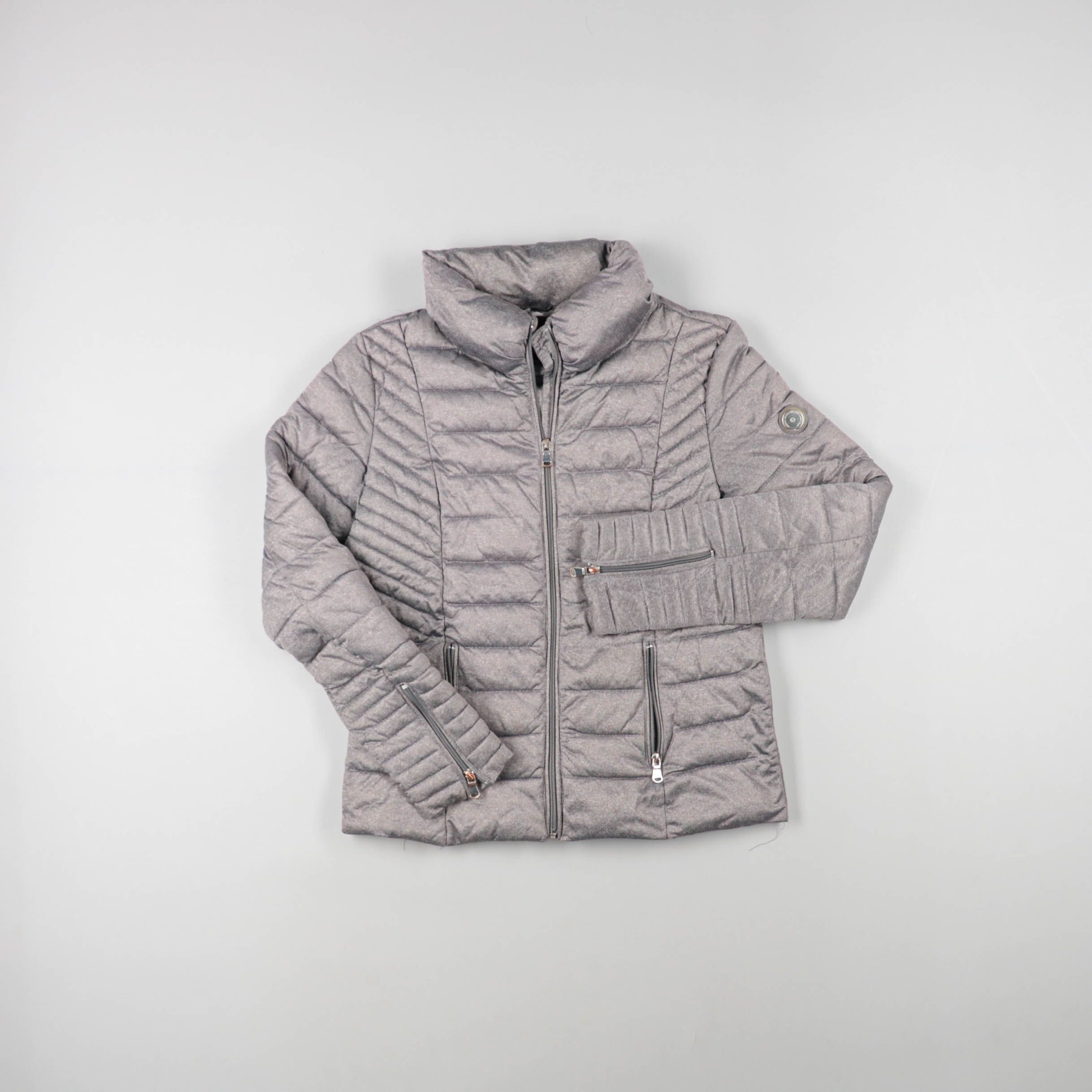 Стёганая женская куртка с высоким воротником-стойкой и застёжкой на молнию. Подойдёт для прохладной погоды в межсезонье и для повседневных городских образов. Практичный плюс — несколько карманов на молнии для мелочей.