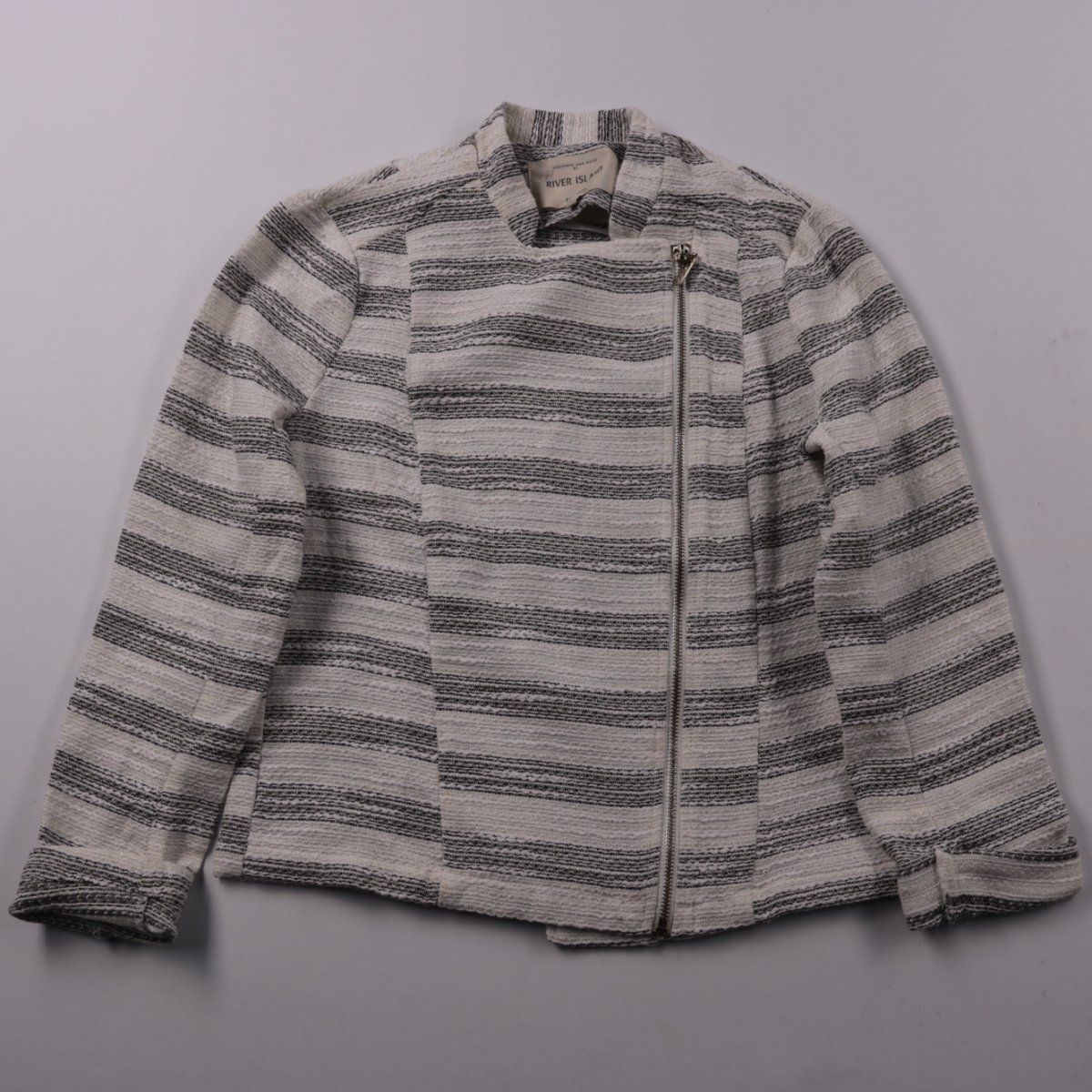 Лёгкая женская куртка River Island из фактурной ткани в серо-белую полоску с асимметричной молнией. Подойдёт для прохладной весны и осени и легко сочетается с джинсами или платьем. Практична тем, что не продувается и быстро приводит образ в аккуратный вид без лишних деталей.