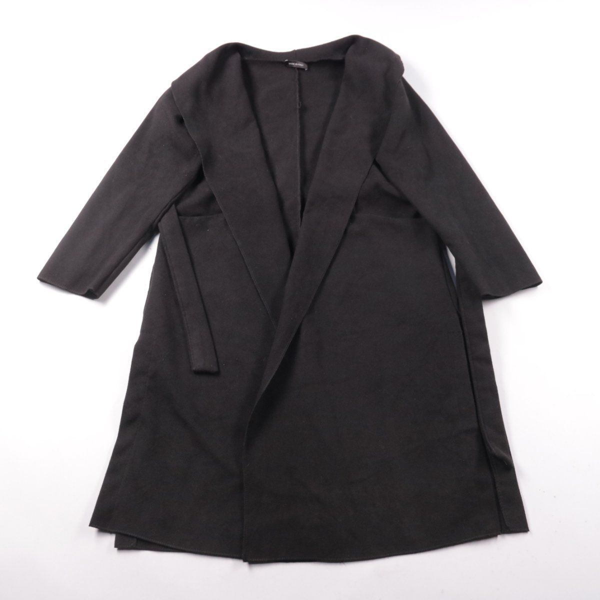 Чёрное пальто без видимого бренда, с запахом и широким шалевым воротником, произведено в Италии. Подойдёт для повседневных и офисных образов в демисезон, хорошо смотрится с ботильонами и кроссовками. Пояс позволяет регулировать посадку по фигуре, а полиэстер проще в уходе.