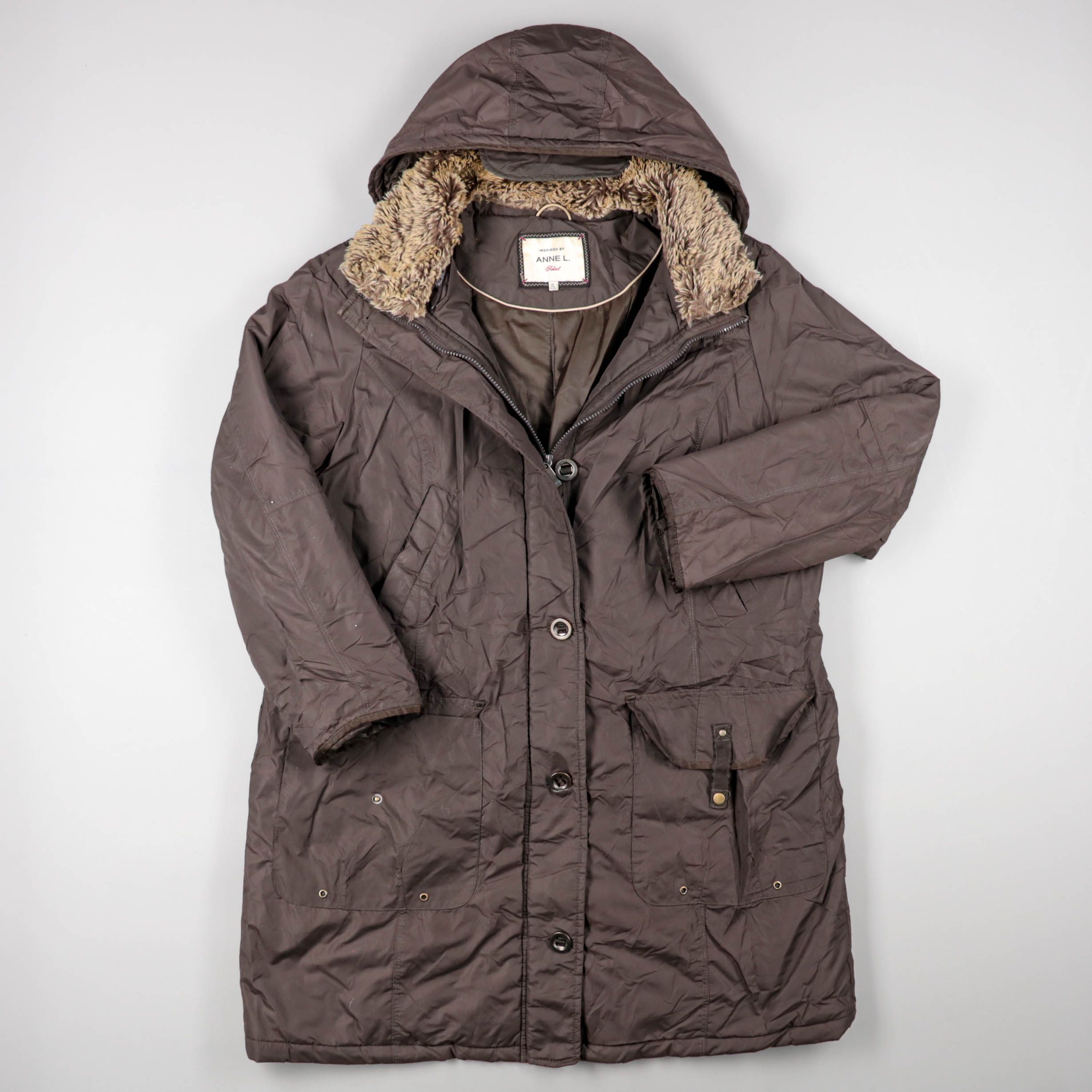 Зимняя куртка Anne L. тёмно-коричневого цвета с капюшоном и меховой отделкой по воротнику. Подойдёт для повседневной носки в холодную погоду, удобна для прогулок и дороги на работу. Практичные накладные карманы и застёжка на молнию с планкой на кнопках...