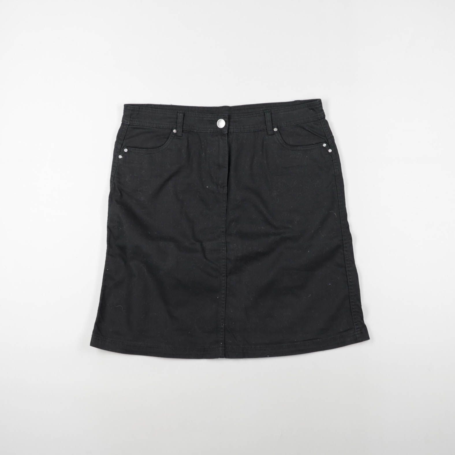 Женская чёрная юбка из плотной ткани в стиле casual, с классической посадкой и застёжкой на пуговицу. Подойдёт для повседневных образов и в офис с рубашкой или водолазкой. Практичный плюс — немаркий цвет и удобные карманы со заклёпками.