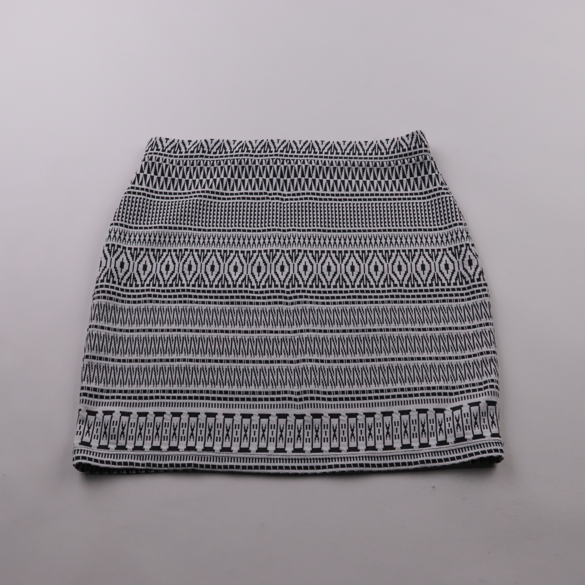 Юбка Dunnes с чёрно-белым геометрическим узором, хорошо смотрится с однотонным верхом и базовой обувью. Подойдёт для города и офиса в стиле casual, а также для поездок и прогулок. Трикотажная ткань почти не мнётся и за счёт эластана комфортно тянется.