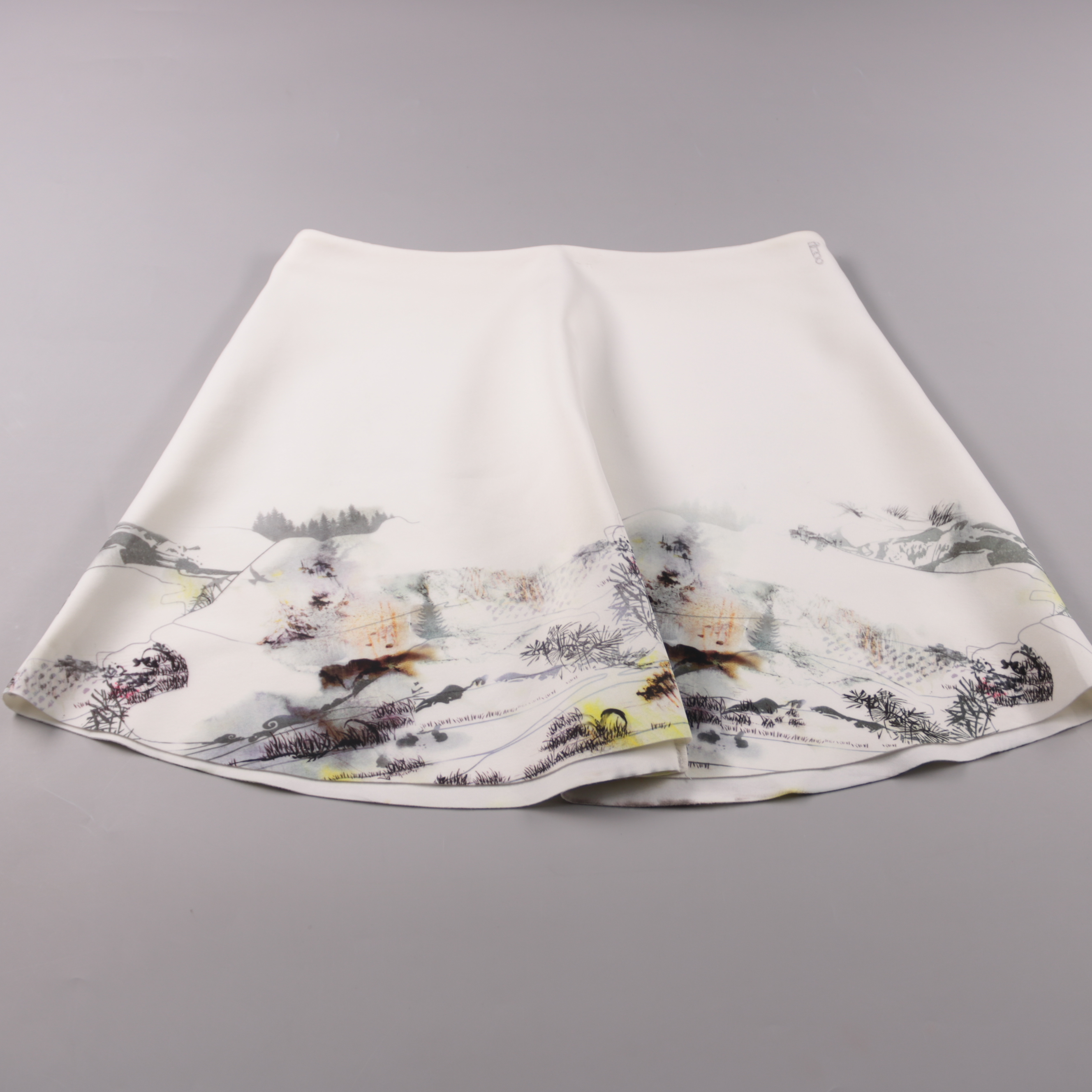 Юбка Ikoo молочного цвета с пейзажным принтом по низу и расклешённым силуэтом. Подойдёт для летних прогулок и отпуска, легко сочетается с однотонными топами и футболками. Практичное преимущество — светлая база и неброский рисунок, которые делают образ ...