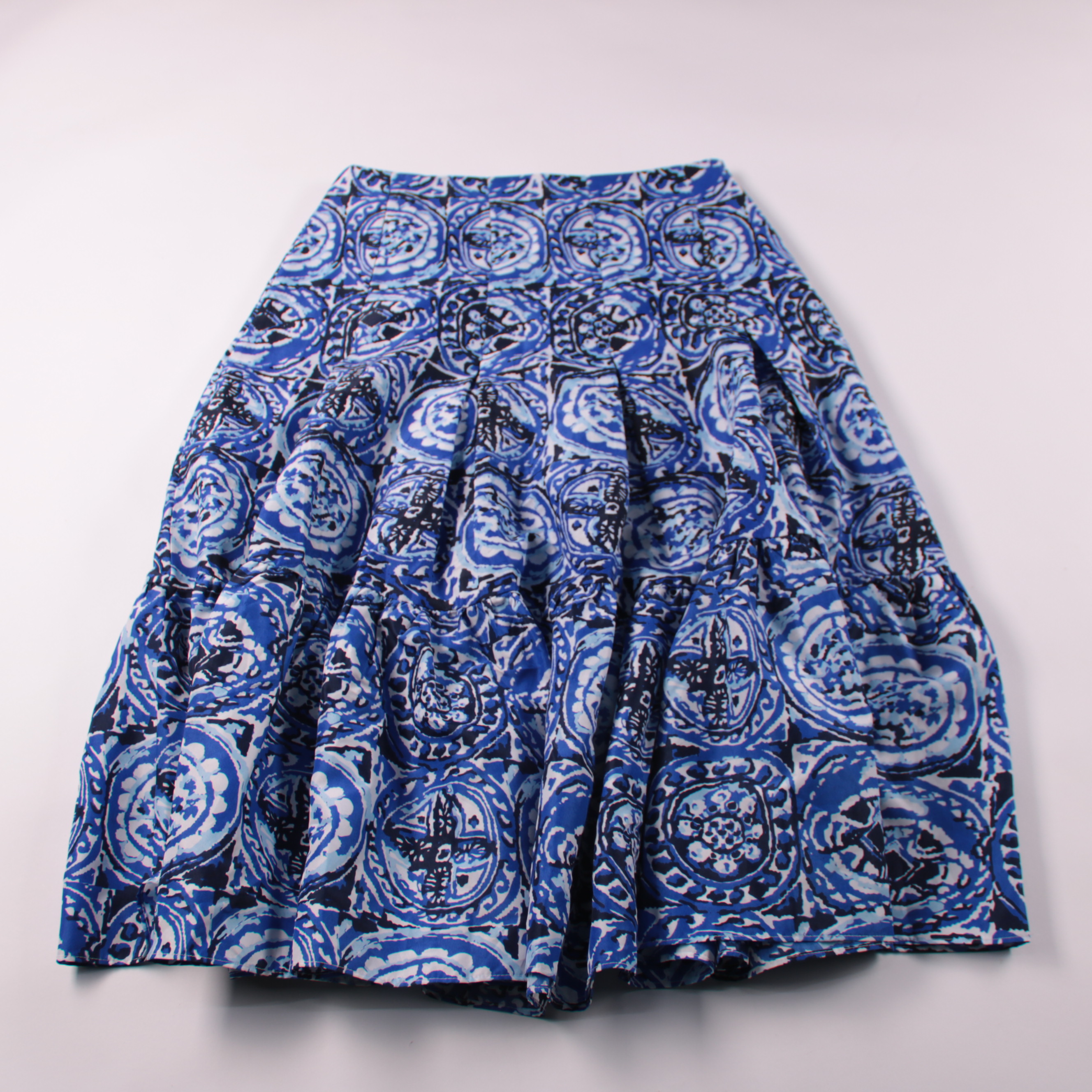 Юбка Sayida с ярким сине-белым принтом и пышным кроем. Подойдёт для летних прогулок и отпуска, хорошо сочетается с однотонным топом или рубашкой. Лёгкая ткань быстро сохнет и почти не мнётся в носке.
