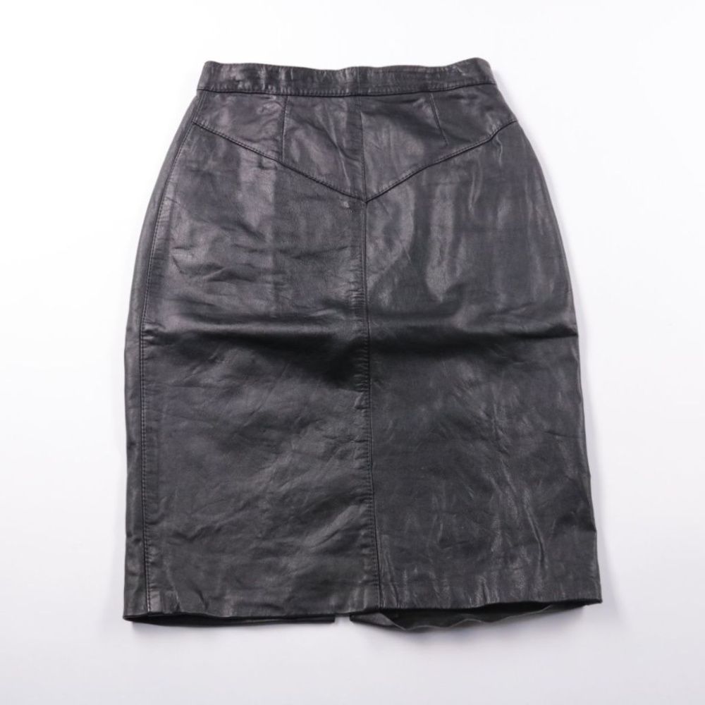 Женская кожаная юбка миди чёрного цвета с разрезом сзади. Подойдёт для офиса и повседневных образов с рубашкой, водолазкой или свитером. Практичный материал легко протирать, а посадка по талии хорошо держит форму.
