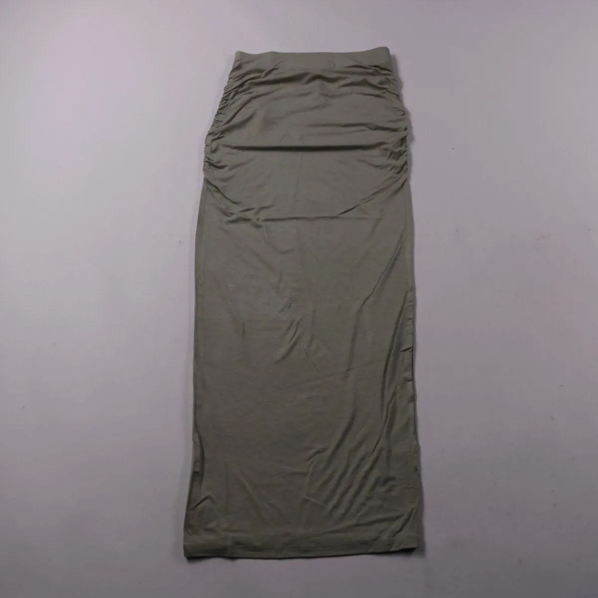 Длинная юбка-карандаш Gina Tricot в оттенке хаки с драпировкой по бокам. Подойдёт для повседневных образов и вечерних выходов, ткань хорошо тянется и мягко садится по фигуре. Практична в носке и не сковывает движения.